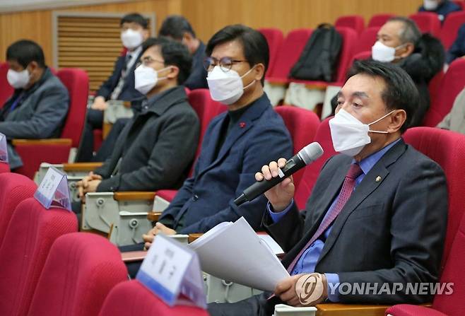 (경주=연합뉴스) 손대성 기자 = 14일 경북 경주 월성원자력본부 홍보관에서 국민의힘 김석기 의원(경주)이 최근 불거진 삼중수소 검출 논란을 확인하기 위해 원흥대 월성원자력본부장을 상대로 질문하고 있다. 2021.1.14