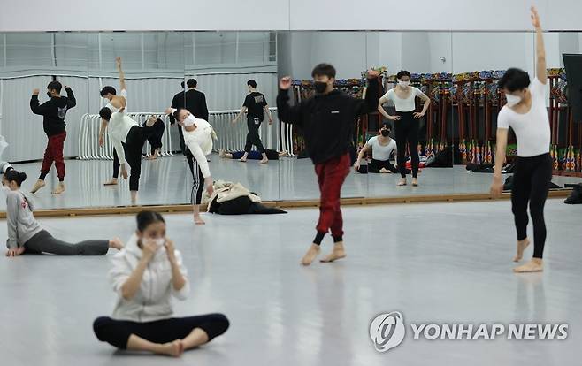 (서울=연합뉴스) 홍해인 기자 = 2021학년도 대입 정시모집 실기고사가 시작된 14일 서울 성북구 한성대학교에서 크리에이티브인문예술대학 예술학부 현대무용 전공에 응시한 수험생들이 실기고사에 앞서 대기실에서 마지막 연습을 하고 있다. 2021.1.14