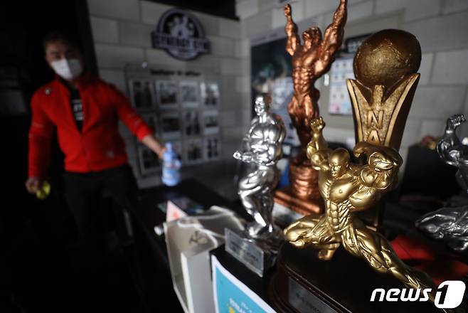(인천=뉴스1) 정진욱 기자 = 정부가 방역 조치 형평성을 고려해 거리두기 재조정을 검토하고 있는 가운데, 14일 인천시 남동구 간석동 시너지 짐 PT헬스장에서 김장환 대표가 트로피를 바라보고 있다. 2021.1.14/뉴스1