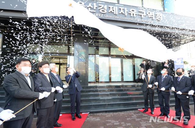 [울산=뉴시스] 배병수 기자 = 울산경제자유구역청 개청식이 14일 오후 청사 정문 앞에서 열린 가운데 성윤모 산업통상자원부 장관, 송철호 시장 , 울산 국회의원등 참석자들이 현판식을 가지고 있다. 2021.01.14. bbs@newsis.com