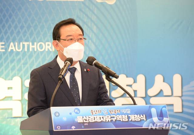 [울산=뉴시스] 배병수 기자 = 송철호 울산시장이 14일 오후 울산 시의회 1층 시민 홀에서 열린 울산경제자유구역청 개청식에서 인사말을 하고 있다. 2021.01.14. bbs@newsis.com