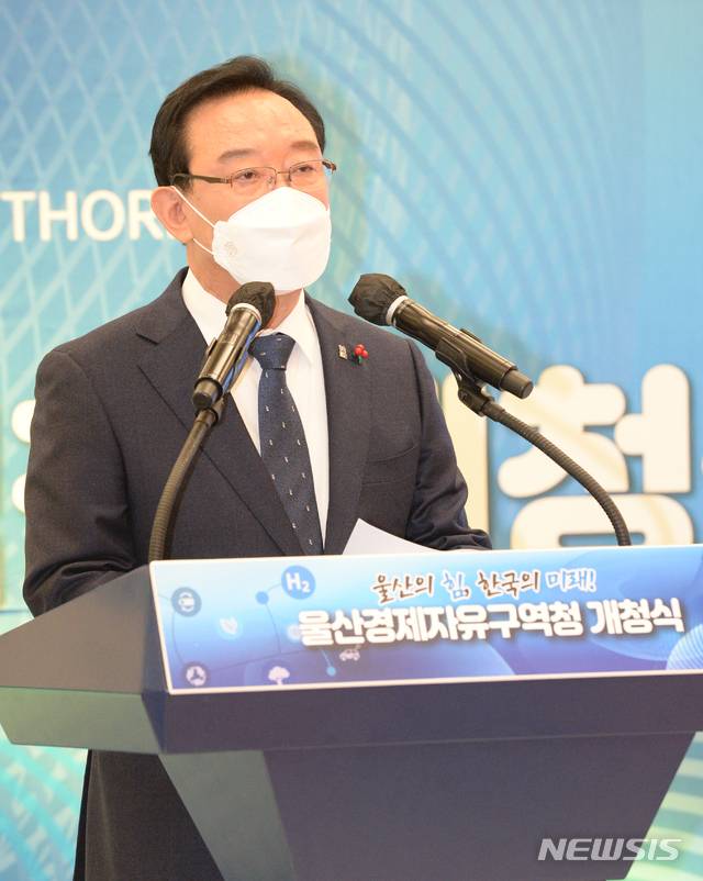 [울산=뉴시스] 배병수 기자 = 송철호 울산시장이 14일 오후 울산 시의회 1층 시민 홀에서 열린 울산경제자유구역청 개청식에서 인사말을 하고 있다. 2021.01.14. bbs@newsis.com
