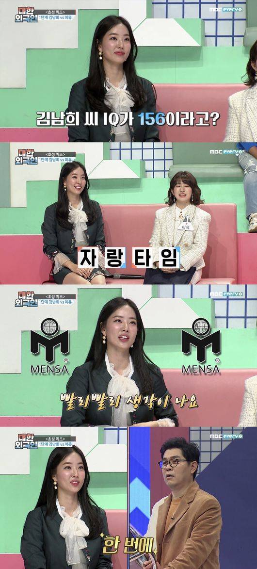 김남희는 화제가 된 아이큐에 대해 "아이큐 테스트에서 156을 받았는데, 정말 우리나라 국민들 자체가 똑똑하다고 생각한다. 궁금해서 책을 찾아보니까, 거기서도 그렇게 나오더라. 멘사 시험도 사실 그렇게 어렵지 않다. 도형 문제라서 모르겠다면 느낌상으로 논리없이 직관적으로 찍어도 된다"고 겸손하게 말했다.