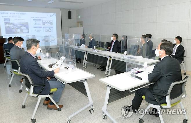 (서울=연합뉴스) 성윤모 산업통상자원부 장관이 14일 울산테크노파크 수소연료전지실증화센터를 방문해 관계자들과 간담회를 하고 있다. 2021.1.14