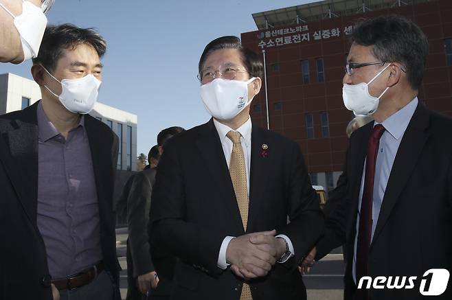 (울산=뉴스1) 윤일지 기자 = 성윤모 산업통상자원부 장관이 14일 오후 울산시 남구 울산테크노파크 수소연료전지 실증화 센터를 찾아 시설을 둘러보고 있다. 2021.1.14/뉴스1