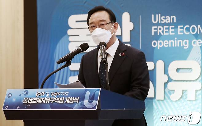 (울산=뉴스1) 윤일지 기자 = 송철호 울산시장이 14일 오후 울산시청 시민홀에서 열린 울산경제자유구역청 개청식에서 환영사를 하고 있다. 2021.1.14/뉴스1