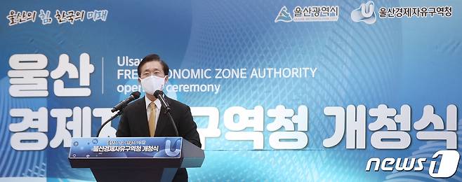 (울산=뉴스1) 윤일지 기자 = 성윤모 산업통상자원부 장관이 14일 오후 울산시청 시민홀에서 열린 울산경제자유구역청 개청식에서 축사를 하고 있다. 2021.1.14/뉴스1