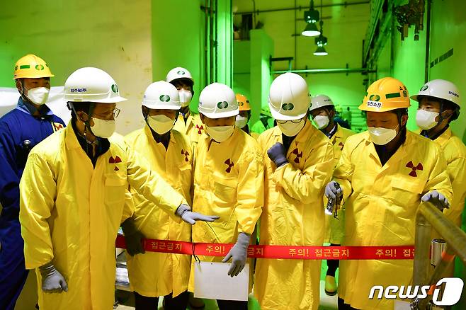 (경주=뉴스1) 최창호 기자 = 국민의힘 김석기(경주)의원과 같은 당 이철규 산자위 간사, 김영식 과방위원이 14일 최근 논란이 되고 있는 삼중수소 문제와 관련 한수원(주) 월성원자력본부 발전소 현장을 찾아 원전 관계자로부터 운영 현황에 대한 설명을 듣고 있다. (월성원자력본부제공)2021.1.14/뉴스1
