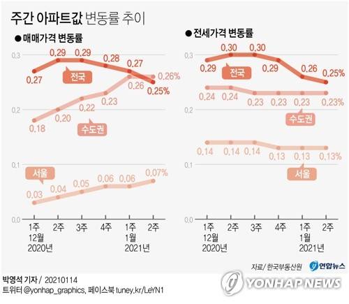 (서울=연합뉴스) 이재윤 기자 = 한국부동산원(옛 한국감정원)은 1월 둘째 주(11일 기준) 전국의 아파트 매매가격이 0.25% 올라 지난주(0.27%)보다 상승 폭이 소폭 줄었다고 14일 밝혔다.