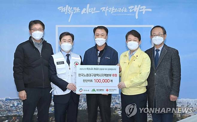 (대구=연합뉴스) 한국노총 대구지역본부(의장 김위상.가운데)는 14일 오후 대구시청에서 코로나19 진단키트 10만개(2억5천만원 상당)를 대한적십자사 대구지사에 전달했다. 2021.1.14.