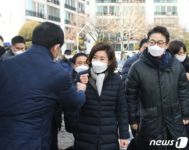 (서울=뉴스1) 국회사진취재단 = 서울시장 보궐선거 출마를 선언한 나경원 국민의힘 전 의원이 14일 오후 재건축 추진 중인 서울 금천구 남서울 럭키아파트를 방문해 지역 주민들과 인사하고 있다. 2021.1.14/뉴스1