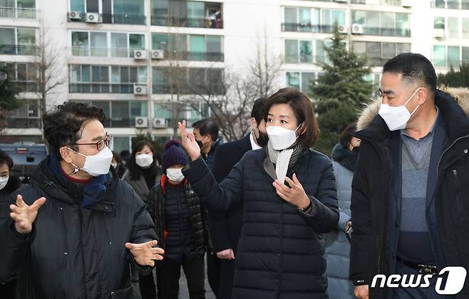 (서울=뉴스1) 국회사진취재단 = 서울시장 보궐선거 출마를 선언한 나경원 국민의힘 전 의원이 14일 오후 재건축 추진 중인 서울 금천구 남서울 럭키아파트를 방문해 지역 주민의 고충을 듣고 있다. 2021.1.14/뉴스1