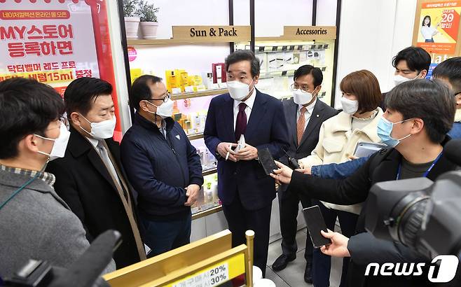 (서울=뉴스1) 국회사진취재단 = 이낙연 더불어민주당 대표가 14일 오후 코로나19 이익공유제 실현 현장 방문의 일환으로 서울 영등포 지하상가 내 네이처컬렉션을 방문해 상인들과 대화하고 있다. 2021.1.14/뉴스1