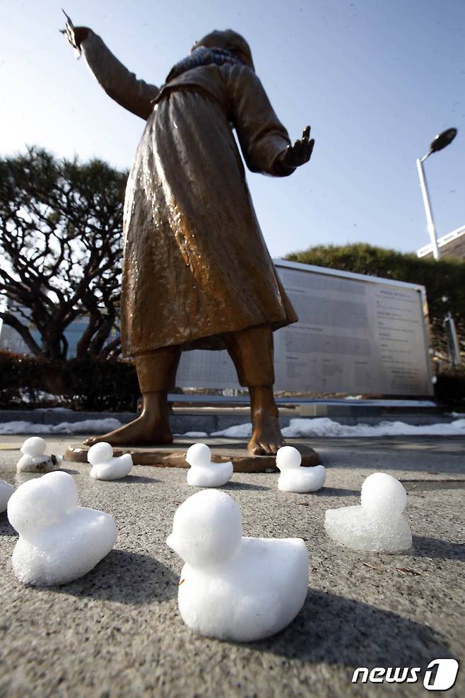 (광주=뉴스1) 허단비 기자 = 14일 오후 광주 북구청 평화의소녀상 앞에 눈으로 만든 오리가 놓여있다.(광주북구 제공)2021.1.14/뉴스1
