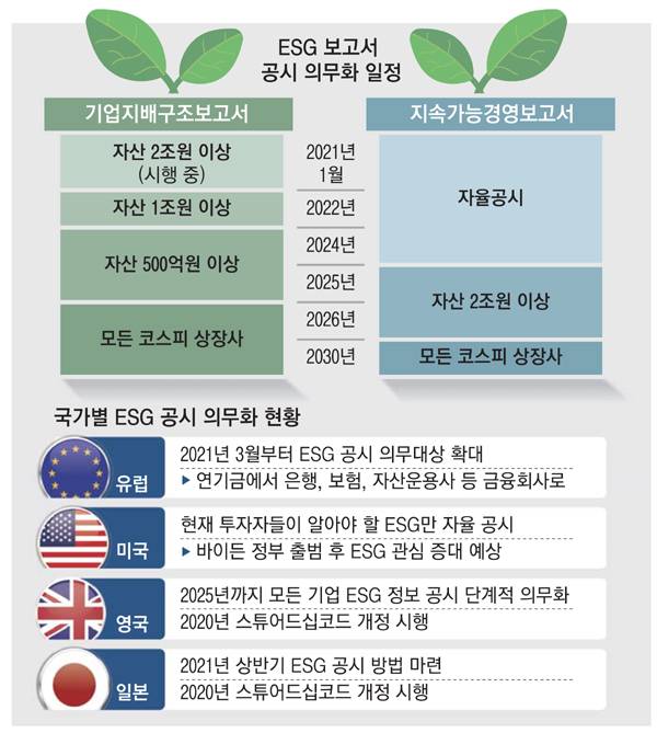이를 위해 친환경과 사회적 책임 문제를 담은 '지속가능경영보고서'와 지배구조를 포함한 '기업지배구조보고서' 공시를 단계적으로 의무화한다.