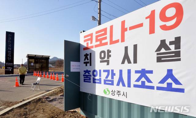 [상주=뉴시스] 이무열 기자 = 14일 오후 신종 코로나바이러스 감염증(코로나19) 확산 진원지로 떠오른 경북 상주 BTJ열방센터 입구에 코로나19 취약시설 출입감시초소가 설치돼 있다. 2021.01.14. lmy@newsis.com