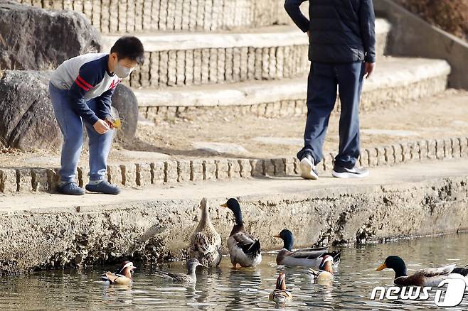 (광주=뉴스1) 허단비 기자 = 낮 기온이 영상 14도 까지 오른 14일 오후 광주 북구 전남대학교에서 한 어린이가 오리에게 간식을 주고 있다.(광주북구 제공)2021.1.14/뉴스1