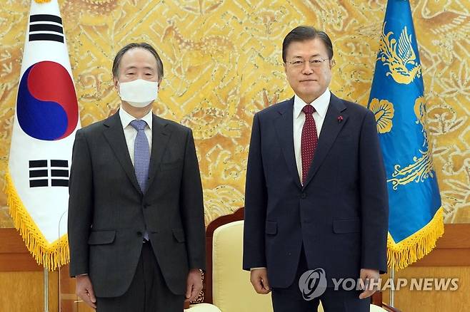 (서울=연합뉴스) 문재인 대통령이 14일 오전 청와대 접견실에서 도미타 고지 주한일본대사를 접견하고 있다. 2021.1.14 [청와대 제공. 재판매 및 DB금지]