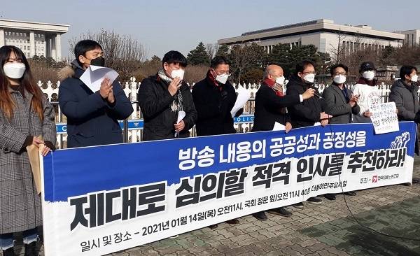 이날 오정훈 전국언론노조위원장은 "학연과 개인적 인맥에 근거해 정실인사를 고집한다면 국회의장과 더불어민주당은 감당할 수 없는 비난에 직면할 각오를 해야 할 것"이라며 "출처를 알 수 없는 정치권의 하마평이 아닌, 유능한 인재를 공정하게 심사해 추천하는 공당의 책임 있는 모습을 촉구한다"고 밝혔다.