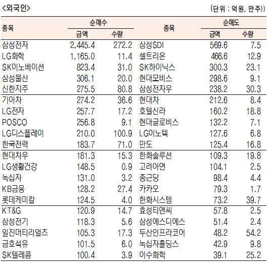 - [표]유가증권 기관·외국인·개인 순매수·도 상위종목(1월 11일-최종치)