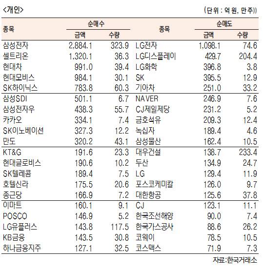 - [표]유가증권 기관·외국인·개인 순매수·도 상위종목(1월 13일-최종치)