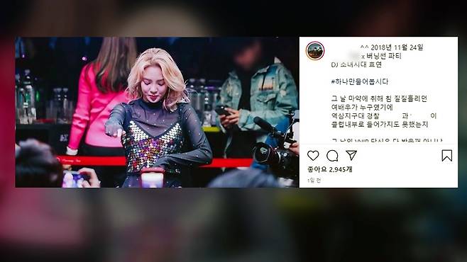 김 씨는 자신의 SNS에 버닝썬 클럽에서 디제잉을 하는 효연의 사진을 올리고 "당신은 다 봤을 것 아니냐"고 적었습니다.