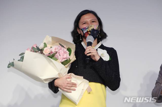 [서울=뉴시스]김병문 기자 = 델핀 오 UN 세대평등포럼 사무총장이 14일 오후 서울 강남구 인터컨티넨탈 서울코엑스에서 열린 ‘한국이미지상’ 시상식에 참석해 징검다리상 수상 소감을 밝히고 있다. 2021.01.14. dadazon@newsis.com
