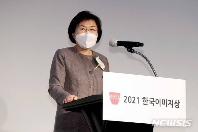 [서울=뉴시스]김병문 기자 = 최정화 CICI 이사장이 14일 오후 서울 강남구 인터컨티넨탈 서울코엑스에서 열린 ‘한국이미지상’ 시상식에 참석해 축사하고 있다. 2021.01.14. dadazon@newsis.com