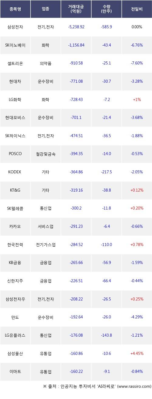 기관 투자자의 순매도 상위 20개 종목은 삼성전자, SK이노베이션, 셀트리온, 현대차, LG화학, 현대모비스, SK하이닉스, POSCO, KODEX 코스닥150 레버리지, KT&G등이다.