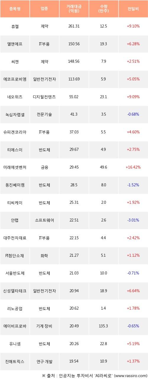 외국인 투자자의 순매수 상위 20개 종목은 휴젤, 엘앤에프, 씨젠, 에코프로비엠, 네오위즈, 녹십자랩셀, 슈피겐코리아, 티에스이, 미래에셋벤처투자, 동진쎄미켐등이다.