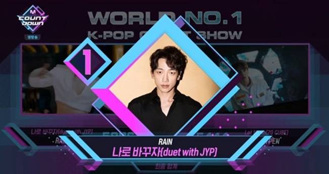 비는 '엠카운트다운' 출연 없이 1위를 차지, MC 이대휘 한현민은 "트로피를 전달드릴 것"이라고 전했다.