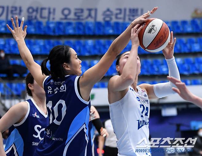 여자프로농구 신한은행과 우리은행의 경기가 14일 인천도원체육관에서 열렸다. 신한은행 유승희가 우리은행 김소니아의 골밑슛을 막아내하고 있다. 인천=허상욱 기자 wook@sportschosun.com/2021.01.14/