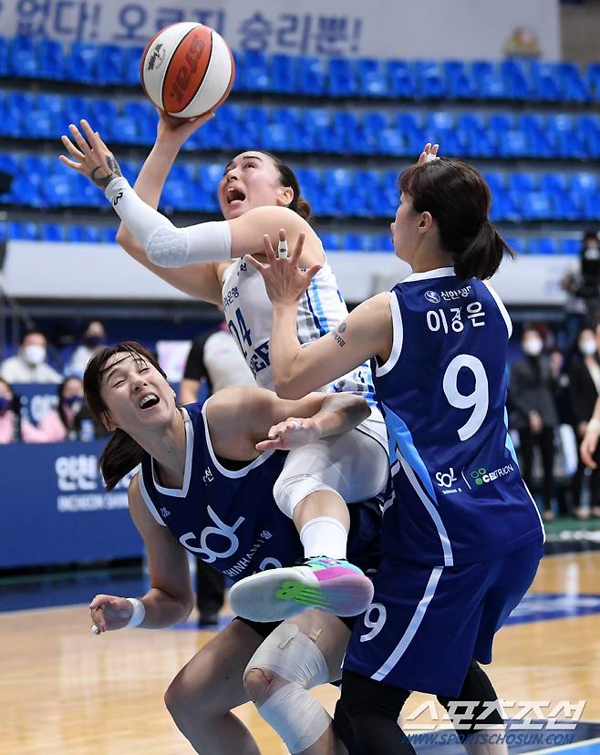 여자프로농구 신한은행과 우리은행의 경기가 14일 인천도원체육관에서 열렸다. 우리은행 김소니아가 신한은행 김단비, 이경은의 수비를 피해 골밑슛을 시도하고 있다. 인천=허상욱 기자 wook@sportschosun.com/2021.01.14/