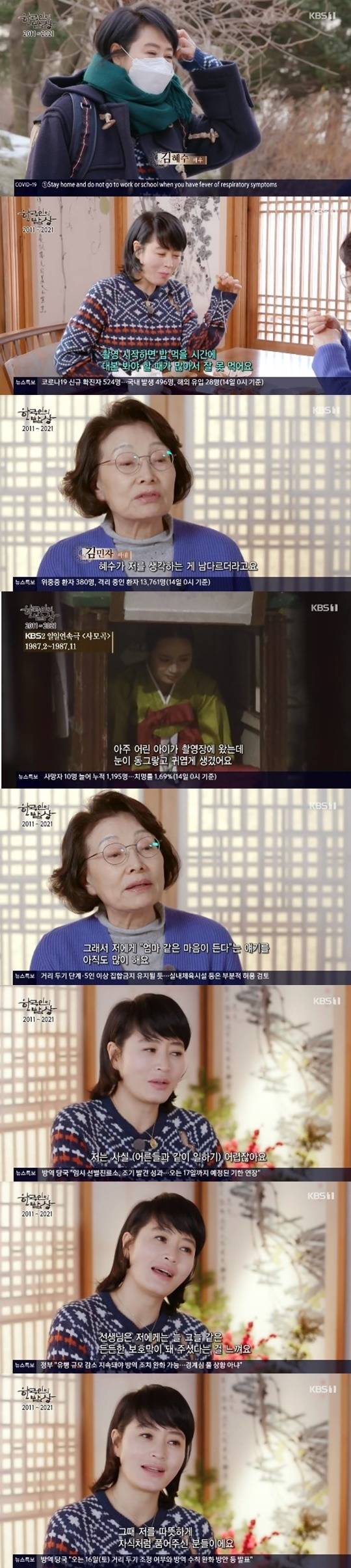 1월 14일 방송된 KBS 1TV '한국인의 밥상'에는 10주년을 맞아 최불암 아내 김민자, 배우 김혜수가 출연했다.