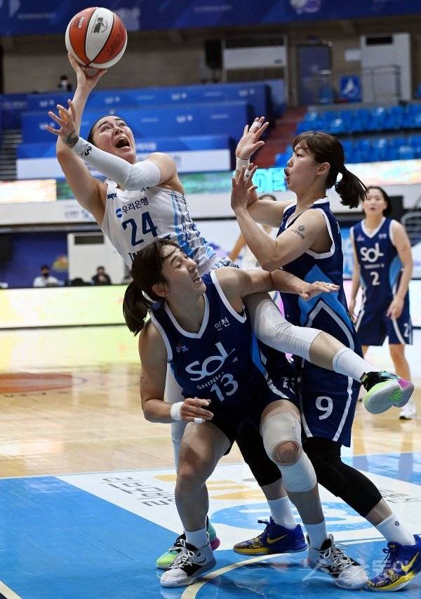 14일 인천 도원체육관에서 열린 ‘KB국민은행 Liiv M 2020-2021 여자프로농구’ 인천 신한은행과 아산 우리은행의 경기에서 우리은행 김소니아가 신한은행 김단비, 이경은의 수비를 피해 슛을 쏘고 있다.