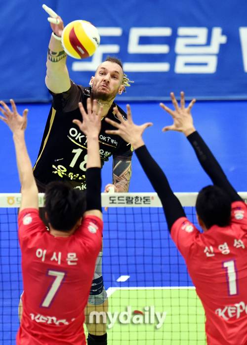 [마이데일리 = 수원 곽경훈 기자] OK금융그룹 펠리페가 14일 오후 경기도 수원실내체육관에서 진행된 '2020-2021 도드람 V-리그' 한국전력-OK금융그룹의 경기에서 공격을 시도하고 있다.- ⓒ마이데일리(www.mydaily.co.kr). 무단전재&재배포 금지 -