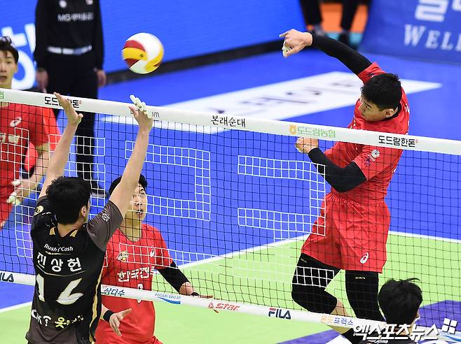 [엑스포츠뉴스 수원, 박지영 기자] 14일 오후 경기도 수원실내체육관에서 열린 '2020-2021 V리그' 남자부 한국전력과 OK금융그룹의 경기, 한국전력 안요한이 공격을 시도하고 있다.