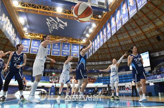 우리은행 홍보람(왼쪽 셋째)이 14일 인천 도원체육관에서 열린 2020-2021 여자프로농구 신한은행과 우리은행의 경기에서 아웃된 공에 대해서 신한은행 김단비의 터치를 주장하는 한편 김단비(가운데)는 손을 흔들어 부인하고 있다. 2021. 1. 14.