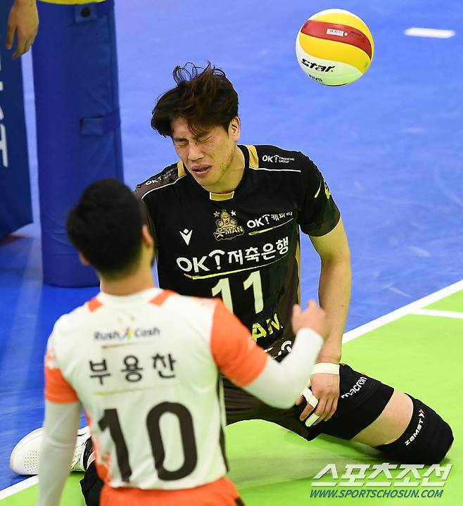 '2020-2021 V리그' 남자부 한국전력과 OK금융그룹의 경기가 14일 수원실내체육관에서 열렸다. OK금융그룹 박원빈이 실책 후 아쉬워하고 있다. 수원=박재만 기자 pjm@sportschosun.com/2021.01.14/
