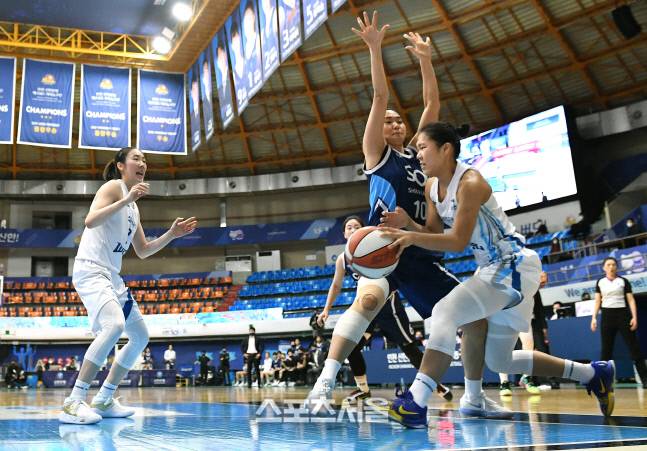 우리은행 박지현(오른쪽)이 14일 인천 도원체육관에서 열린 2020-2021 여자프로농구 신한은행과 우리은행의 경기에서 골밑으로 파고들다 팀동료 박혜진에게 패스를 하고 있다. 2021. 1. 14.