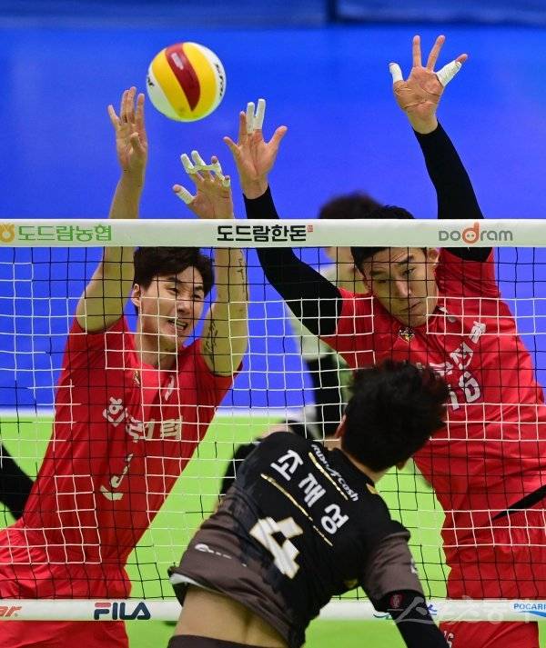 한국전력 박철우와 안요한이 블로킹을 하고 있다.