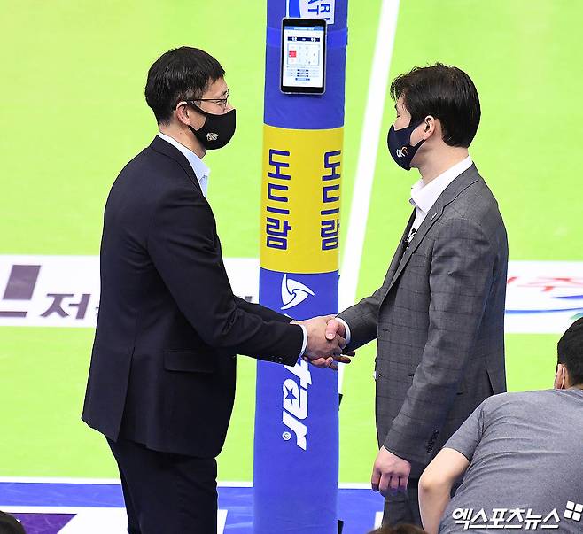 경기 종료 후 한국전력 장병철 감독과 OK금융그룹 석진욱 감독이 악수를 나누고 있다.