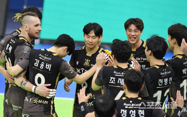 펠리페 등 OK금융그룹의 선수들이 14이 수원체육관에서 진행된 한국전력과의 경기에서 세트 스코어 3-2로 승리한 뒤 기뻐하고있다. 2021.01.13. 김도훈기자 dica@sportsseoul.com