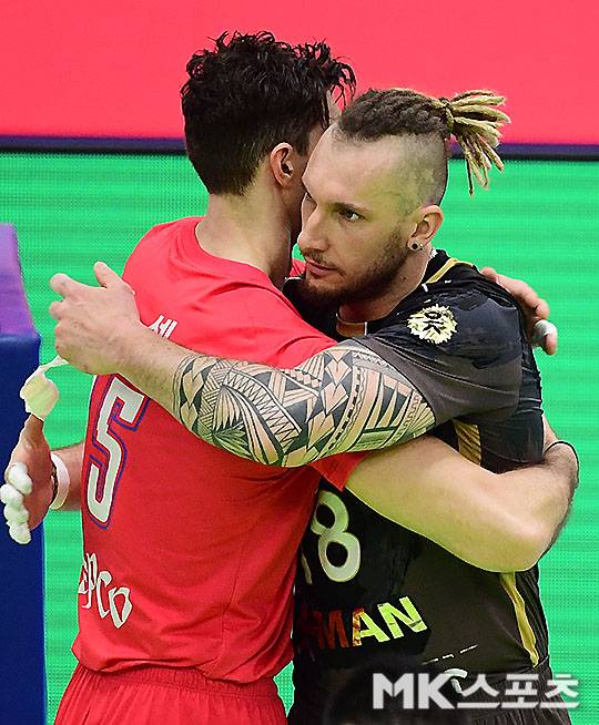 경기를 마친 후 OK금융그룹 펠리페와 한국전력 러셀이 포옹을 나누면서 우정을 나누고 있다.
