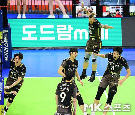 승리를 거둔 OK금융그룹 선수들이 기뻐하고 있다.