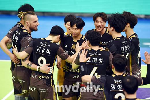 [OK금융그룹이 14일 오후 경기도 수원실내체육관에서 진행된 '2020-2021 도드람 V-리그' 한국전력-OK금융그룹의 경기에서 세트스코어 3-2로 승리한뒤 기뻐하고 있다. 사진 = 수원 곽경훈 기자 kphoto@mydaily.co.kr]- ⓒ마이데일리(www.mydaily.co.kr). 무단전재&재배포 금지 -