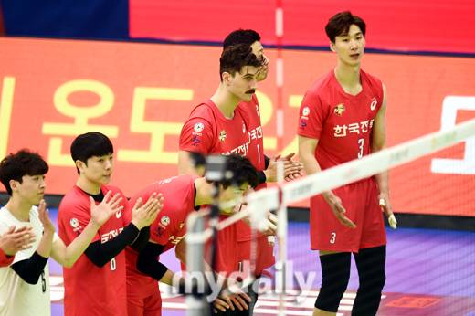 [마이데일리 = 수원 곽경훈 기자] 한국전력 러셀이 14일 오후 경기도 수원실내체육관에서 진행된 '2020-2021 도드람 V-리그' 한국전력-OK금융그룹의 경기에서 세트스코어 3-2로 패배한뒤 아쉬워 하고 있다.- ⓒ마이데일리(www.mydaily.co.kr). 무단전재&재배포 금지 -