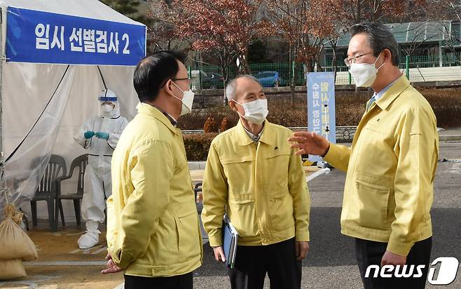 (서울=뉴스1) 박지혜 기자 = 김희겸 행정안전부 재난안전관리본부장이 14일 오후 경기 수원시 장안구 보건소를 방문해 코로나19 백신 전달체계 준비상황 등을 점검하고 있다. (행정안전부 제공) 2021.1.14/뉴스1
