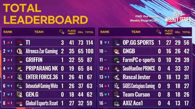 T1은 14일 온라인으로 진행된 'PUBG 위클리 시리즈(PWS)' 동아시아 프리시즌 위클리 스테이지 2주차 2경기(매치6~매치10)에서 65점(킬 포인트 42점)을 쌓으며 데이 우승과 함께 종합 1위를 차지했다.