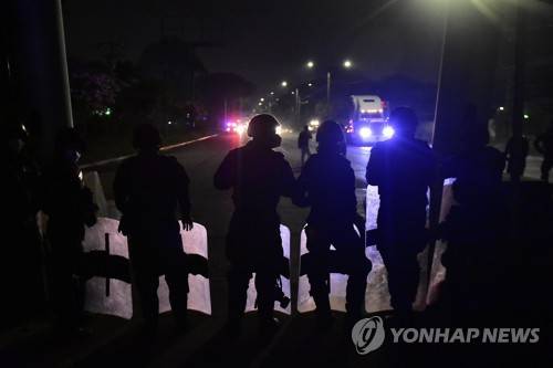 epa08937234 A group of policemen wait to stop the departure of a caravan of migrants, in San Pedro Sula, Honduras, 13 January 2021 (issued 14 January 2021). Some 250 people left Honduras on 13 January night in a caravan to the customs point of Corinto, bordering Guatemala, seeking to head towards the United States. The Government of Guatemala will decree a state of prevention in seven departments of the country as of 14 January, before a possible arrival of migrant caravans from Honduras, media reported. EPA/JOSE VALLE